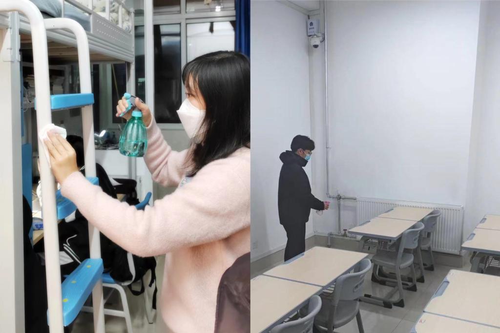 在学院的统一安排下,按照操作规范,各班级、宿舍按比例配兑消毒液,使用专用喷壶进行喷洒,确保消毒消杀质量和效果,不放过每一处卫生死角,实现环境干净整洁,有效预防、控制和消除病毒入侵。
