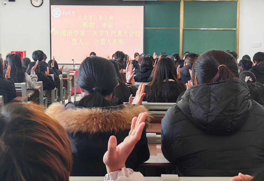 大会在庄严的国歌声中拉开帷幕。会议听取审议了永利集团883042022届学生会主席陈建秀作的工作报告。报告从筑牢思想根基、健全组织建设、弘扬志愿精神、创新活动形式四个方面总结回顾了上一届学生会各项工作情况;讨论了《永利集团88304学生代表选举办法(草案)》;通过了计票人、监票人名单;选举产生了出席我校第七次学生代表大会的代表,圆满完成了各项议程。