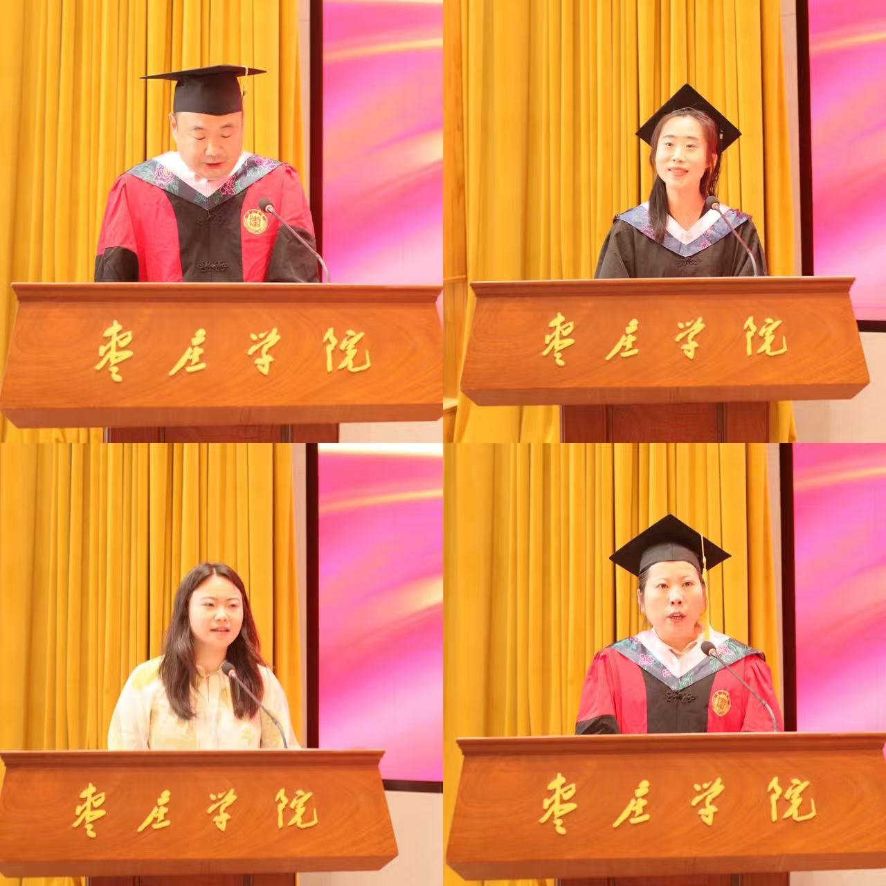 毕业典礼在庄严雄壮的国歌声中拉开序幕。学院副院长孙显云宣读2025届毕业生授予学位名单及班级校友联络员聘任名单。2025届优秀毕业生代表孟燕代表全体毕业生发言。她娓娓道来求学路上的点滴光影,对母校、师长与家人的感激之情溢于言表。最后,她祝愿同学们在多元路径中活出属于自己的精彩,在平凡岗位上成就不凡。在校生代表李妍豫以拳拳之心表达对母校的深情厚谊,对学长姐的真诚祝福与未来期许。教师代表尹健臻寄语毕业生培养文学精神、翻译学精神和语言学精神,坚守人文关怀与理性思维,利用学科知识和科学赋予的能力,在未来世界中大展才华,在广阔天地书写精彩人生。院长韩建侠代表学院全体教职员工向毕业生们表示最热烈的祝贺!韩院长在致辞中深刻探讨了当前外语学科及“外语人”的基本问题思考,勉励毕业生们坚守大学教育所获得的“内在性”智慧:专注于事、独立思考、自律勤勉、自我导向,在当今百年未有之大变局中、在这各种技术迭代发展的时代中,坚信人生际遇的存在与公平,抓住际遇,成就事业,践行时代使命。