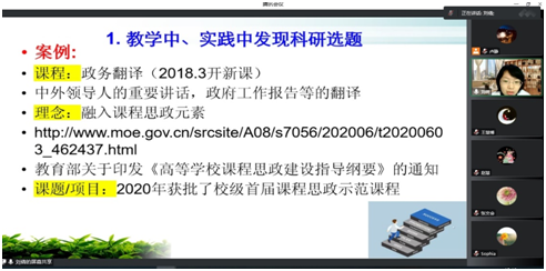 报告中,刘倩老师结合自己的教学和科研经历,从四个方面介绍了青年教师如何兼顾教学和科研:一、在教学中和翻译实践中发现教学和科研选题,总结了“五个一”模式,即:一门课程,一个理念,一个课题,一个项目,一篇论文;二、紧跟学科最新发展动态:听会参会,宣读论文,关注自己学科领域的期刊以及教育部高教司网站;三、阅读文献,静心研读,深挖一个专题;四、发挥传帮带和团队的作用。