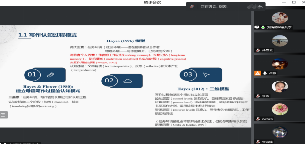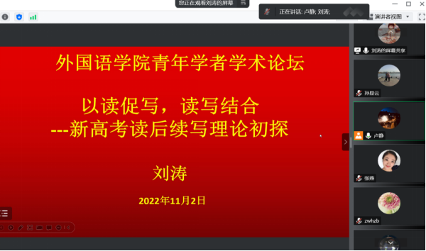 11月2日下午,永利集团88304举办第四期“青年学者学术论坛”。此次论坛采取线上方式进行。学院刘涛副教授、博士作了题为“以读促写,读写结合—新高考读后续写理论初探”的学术报告,全体专任教师和部分学生参加了本次学术论坛。