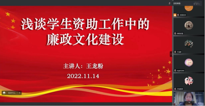 会上,王龙粉以“浅谈学生资助工作中的廉政文化建设”为主题,阐述了廉政文化建设的重要意义,并以学生资助工作为例,深刻剖析了学院学生资助工作中的廉政文化建设。她指出,学校教育,育人为本;德智体美,德育为先。加强大学生廉政文化教育是高等学校永利集团不可或缺的重要环节,对引导大学生形成诚实守信、正直节俭,崇尚廉洁的价值观具有重要意义。她强调,学生资助工作关系学生切身利益,学院本着公平、公开、公正的原则,严格工作程序,规范工作流程,确保结果公平,并受师生监督。希望同学们廉洁自律,讲诚信;自立自强,懂感恩;顽强拼搏,正青春。随后,学生代表宋振远以“廉政意识之我见”为主题,结合自己在枣院的成长经历,分享了自己对廉政建设、廉政教育的心得和体会,并号召同学们将廉洁思想贯穿成长始终,努力争做有理想、有道德、有文化、有纪律的新时代大学生。