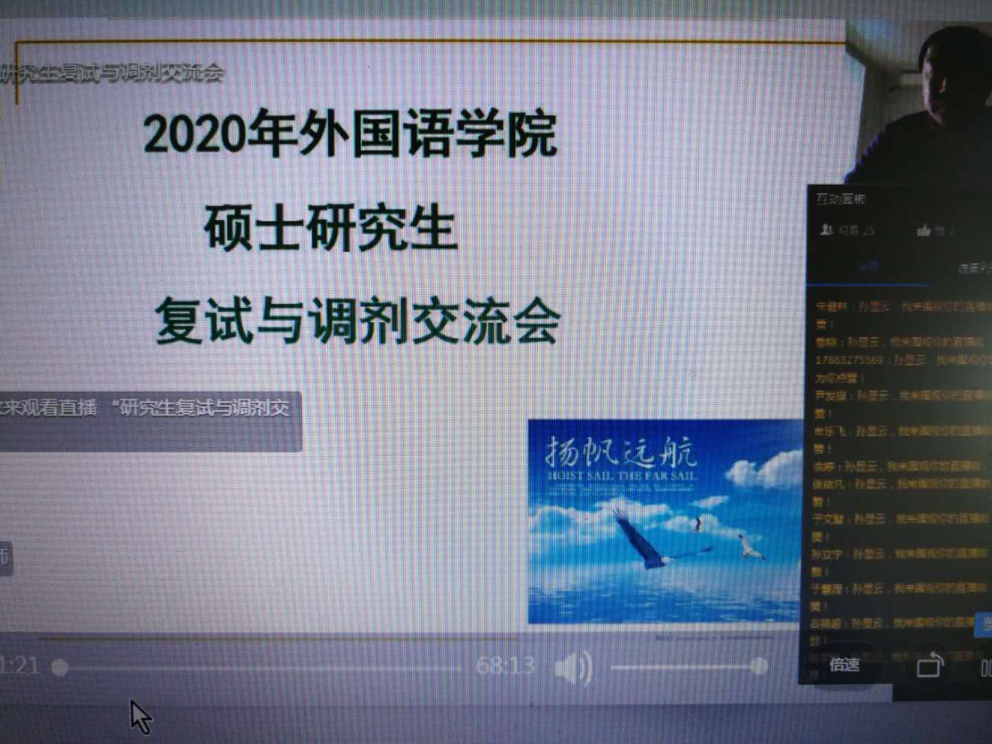 3月30日下午,永利集团88304举办硕士研究生入学复试与调剂线上专题辅导报告会,共有初试成绩有望过线的80余名毕业生参加,辅导报告由永利集团88304副教授、博士孙显云老师主讲。