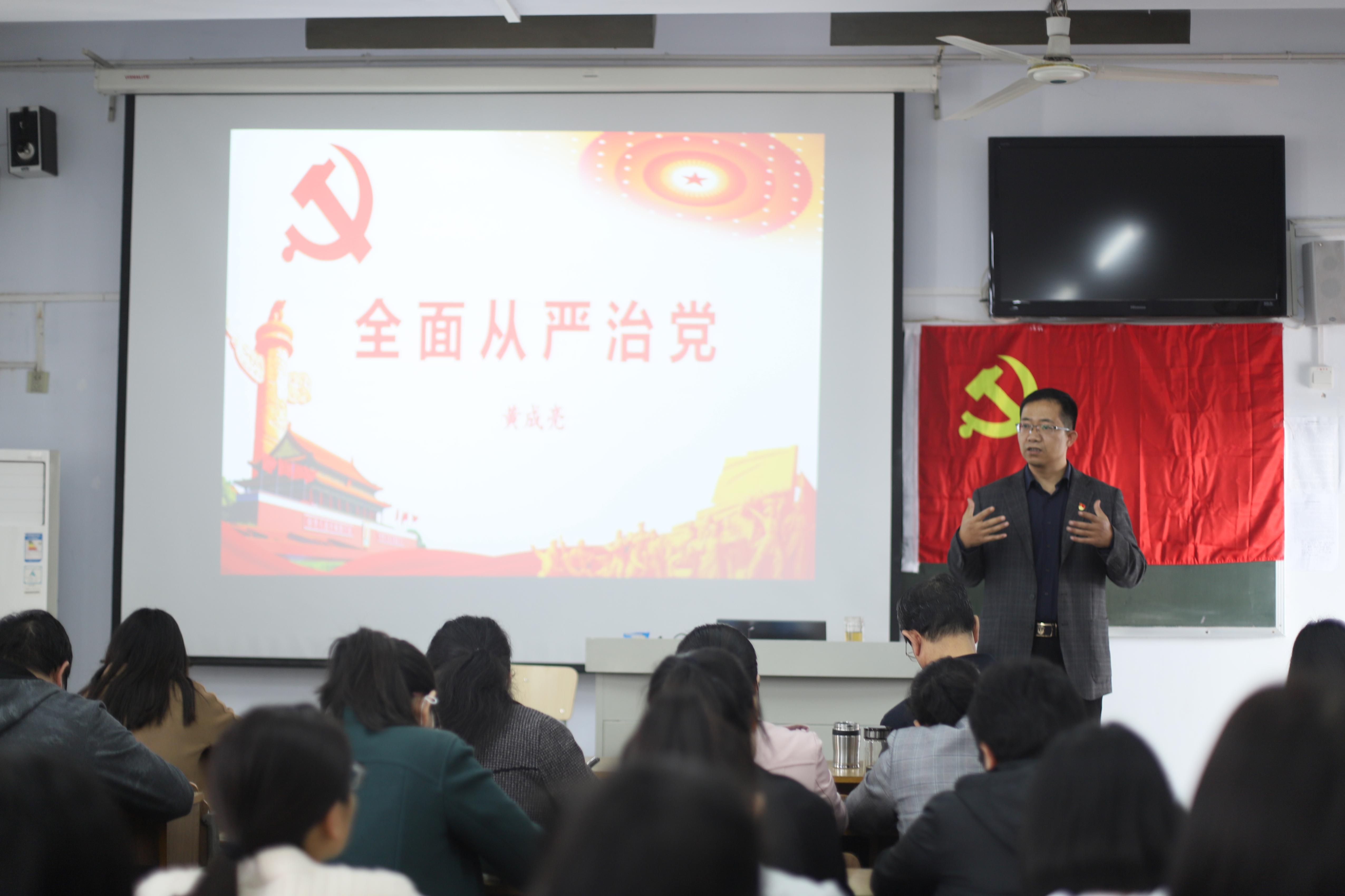 党课教育从四个方面展开:“全面从严治党” 的重大意义;“全面从严治党”治什么;“全面从严治党”的战略部署;“全面从严治党”落实到全体党员。黄成亮指出,目前我国面临着严峻的国际环境,挑战与机遇并存,因此我们必须贯彻党要管党,从严治党的方针,使中国共产党不断提高应对外部环境考验的能力。黄成亮强调全面从严治党要把党的政治建设摆在首位,补足精神之钙,从党内政治生活严起,用制度管党、治党、治吏,用铁的纪律,维护党的团结统一,把反腐败斗争进行到底,发挥巡视监督在党内监督中的利剑作用,完善全面从严治党责任落实制度。黄成亮要求全体师生党员一定要牢记党员身份,增强“四个意识”,践行“四讲四有”,做到“四个合格”。