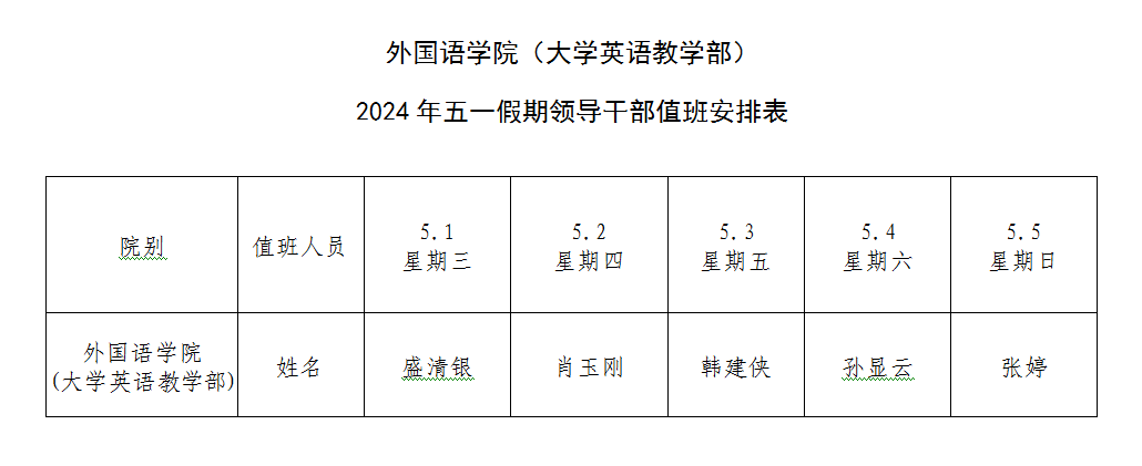 永利集团88304(大学英语教学部)2024年五一假期领导干部值班安排表