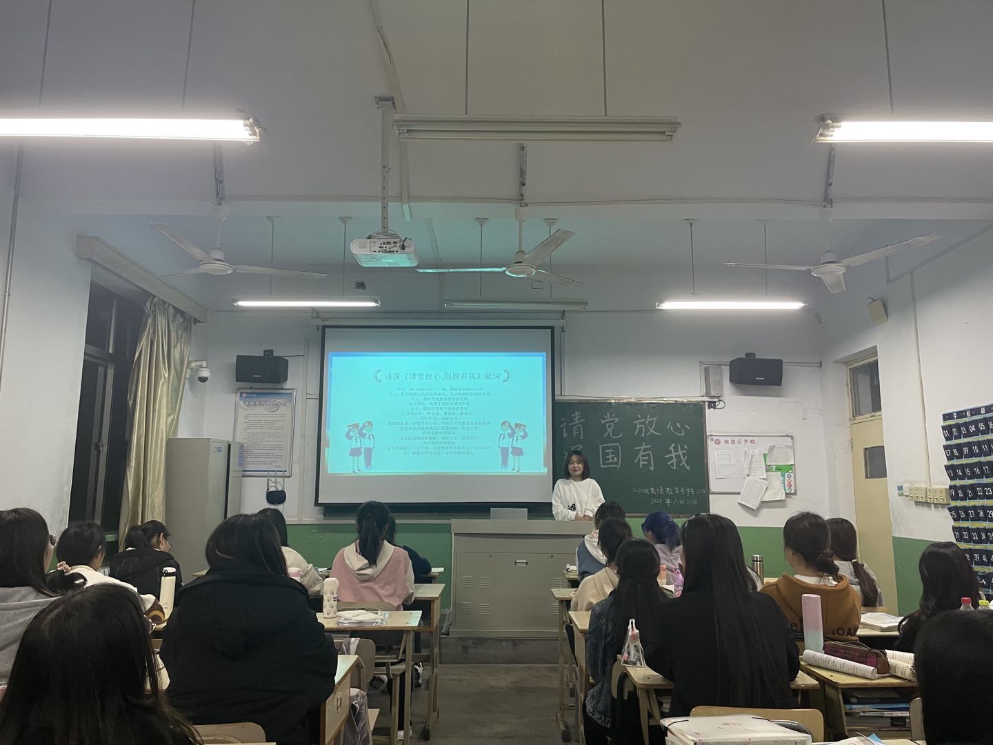 未来属于青年,希望寄予青年。活动期间各班级团支书组织学生们观看了庆祝中国共产党成立100周年大会视频及爱国强党的相关ppt资料,展示中国共产党的历史进程,讲解强国故事,旨在引领学生坚定理想信念、锤炼优良品德,努力践行“请党放心,强国有我”的庄严承诺。