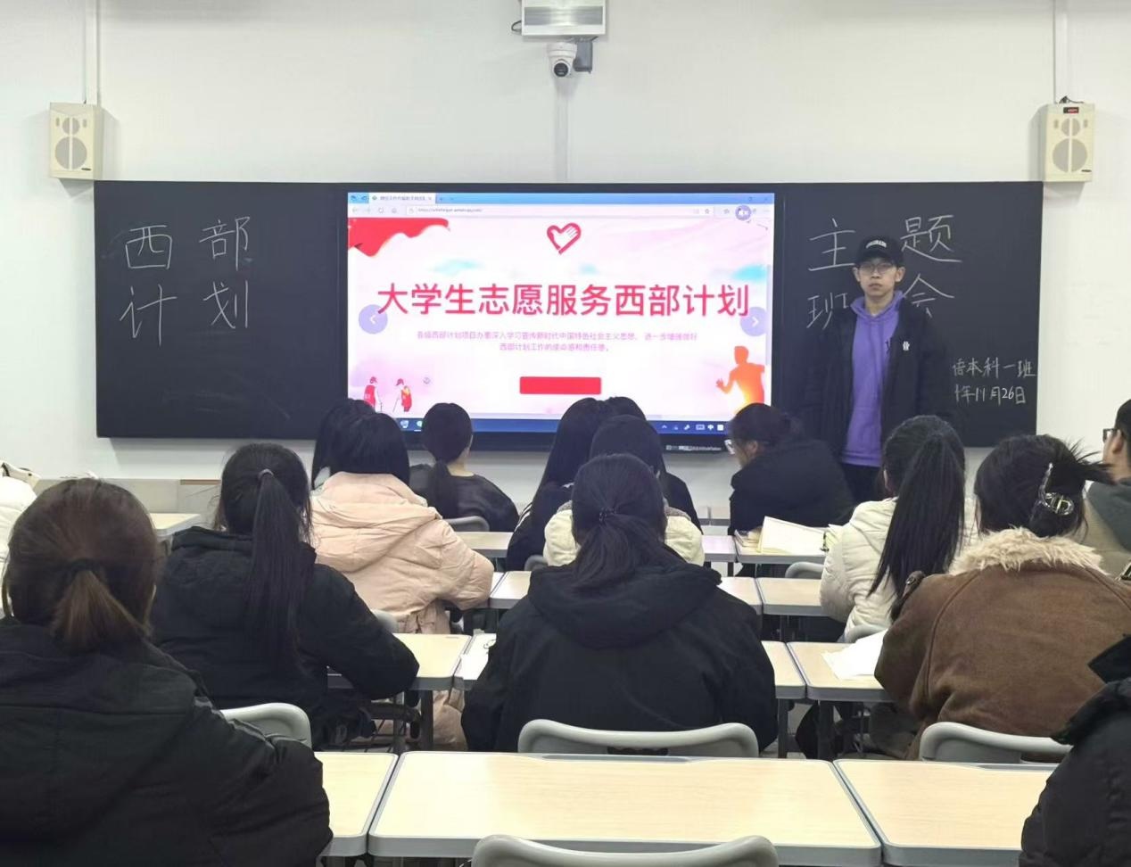 班会上,各班团支书围绕“什么是西部计划”、“西部计划政策解读”、“西部计划服务内容”等方面进行解读,引导同学们深刻认识西部计划的意义,激励广大青年学生到基层、到西部、到祖国和人民最需要的地方建功立业。随后,各班组织学生观看西部计划志愿者相关视频,分享了参加西部计划的学生扎根基层、服务人民的故事。