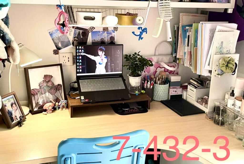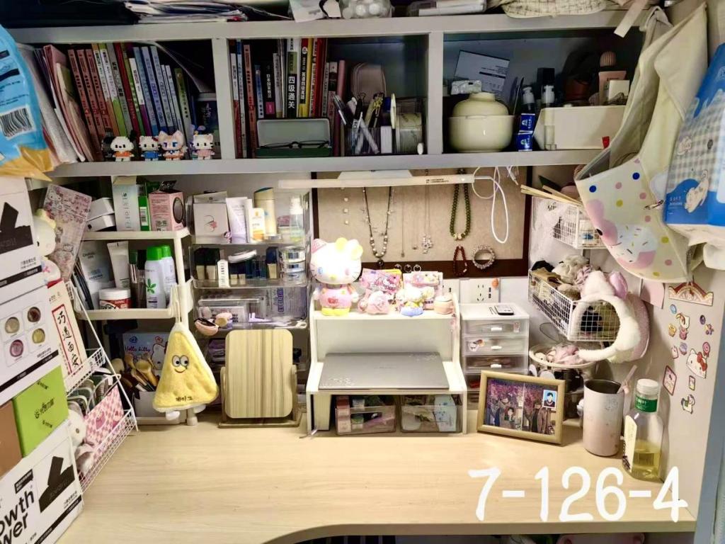 学生巧妙运用各种收纳工具,将衣物、书籍、杂物等物品进行分类整理,将原本杂乱的宿舍桌面改造成了一个个整洁美观的学习与生活空间。
