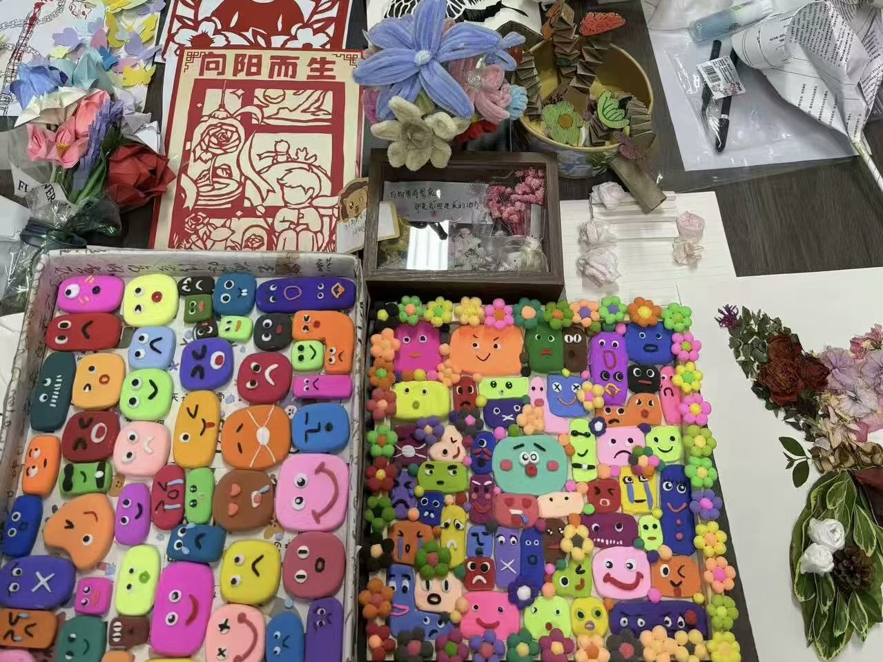 学生一站式社区被精心策划为沉浸式创意工坊,各类手工材料按功能分区陈列,彩色衍纸、环保黏土、可回收废弃物等素材形成多元创作生态。参赛学生展开深度创作:或将彩色衍纸进行剪裁与立体卷曲,拼贴出从低落走向明朗的色彩渐变图案,生动展现情绪渐变轨迹;或对塑料瓶进行环保改造,搭配旧布料扎染的花朵,实现废弃物向艺术装置的生命蜕变。每件作品均附有创作阐释标签,将抽象心理意象转化为具象表达,深度传递积极心理能量。